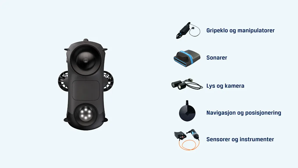 Alt ekstrautstyr er enkelt å koble til, slik at du raskt kan tilpasse ROVen etter dine behov under vann.